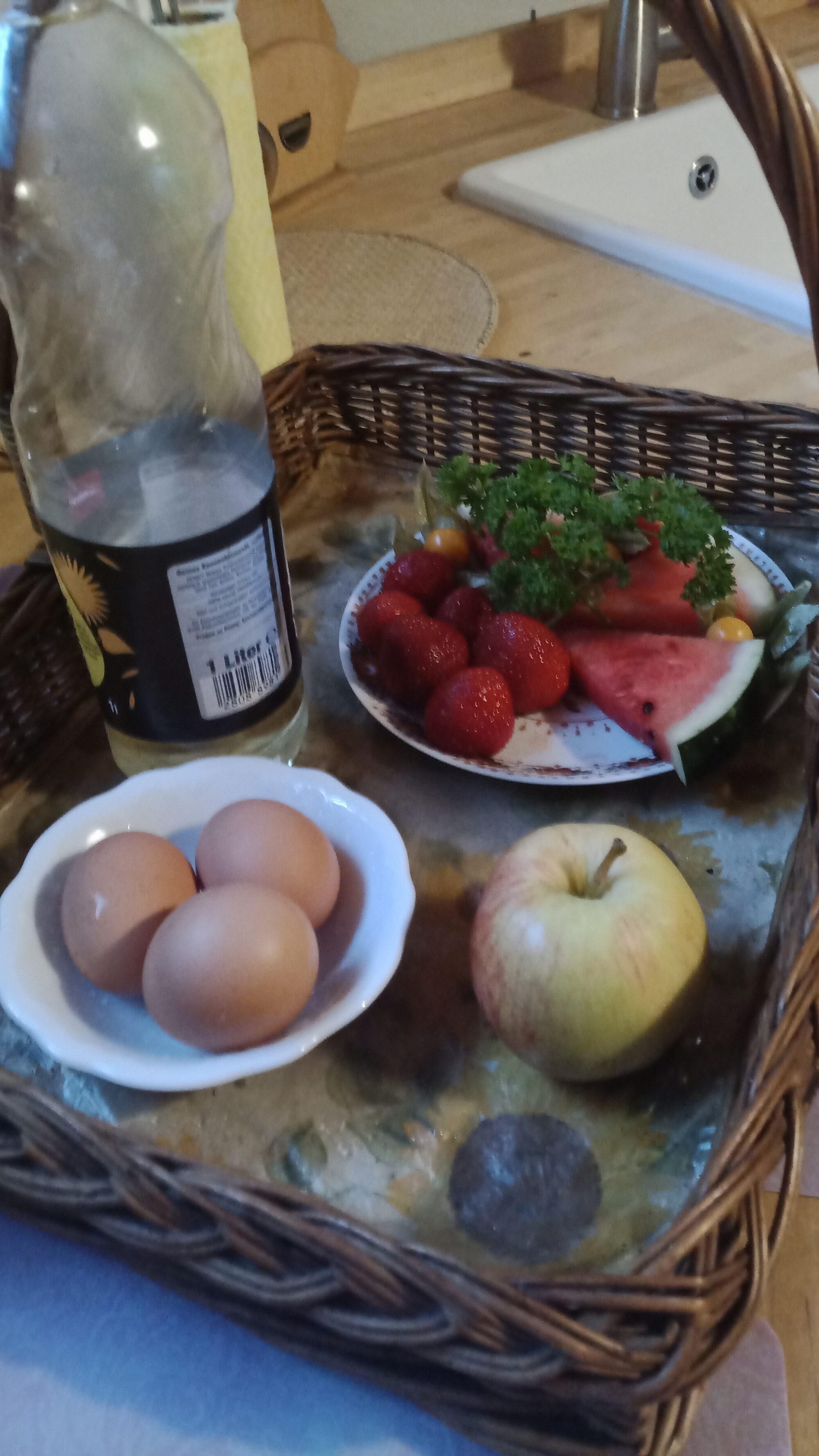 Die Herbergsmutter fragte mich, ob ich Eier möchte für das Frühstück morgen. Dies lehnte ich dankend ab, da ich nicht vor hatte morgen früh nochmal zu kochen und ich sowieso nur leicht frühstücke, um dann später was zu essen. Als ich später wieder in die Küche kam, stand dort ein kleiner Korb mit 3 Eiern, einem Apfel, Erdbeeren, Melone usw. Ich war so baff und happy, dass ich direkt eine Erdbeere naschte (und später noch ein paar mehr). Die übrigen will ich mir für morgen früh übrig lassen. Jetzt werde ich mir morgen früh also doch ein paar Eier machen 🙂