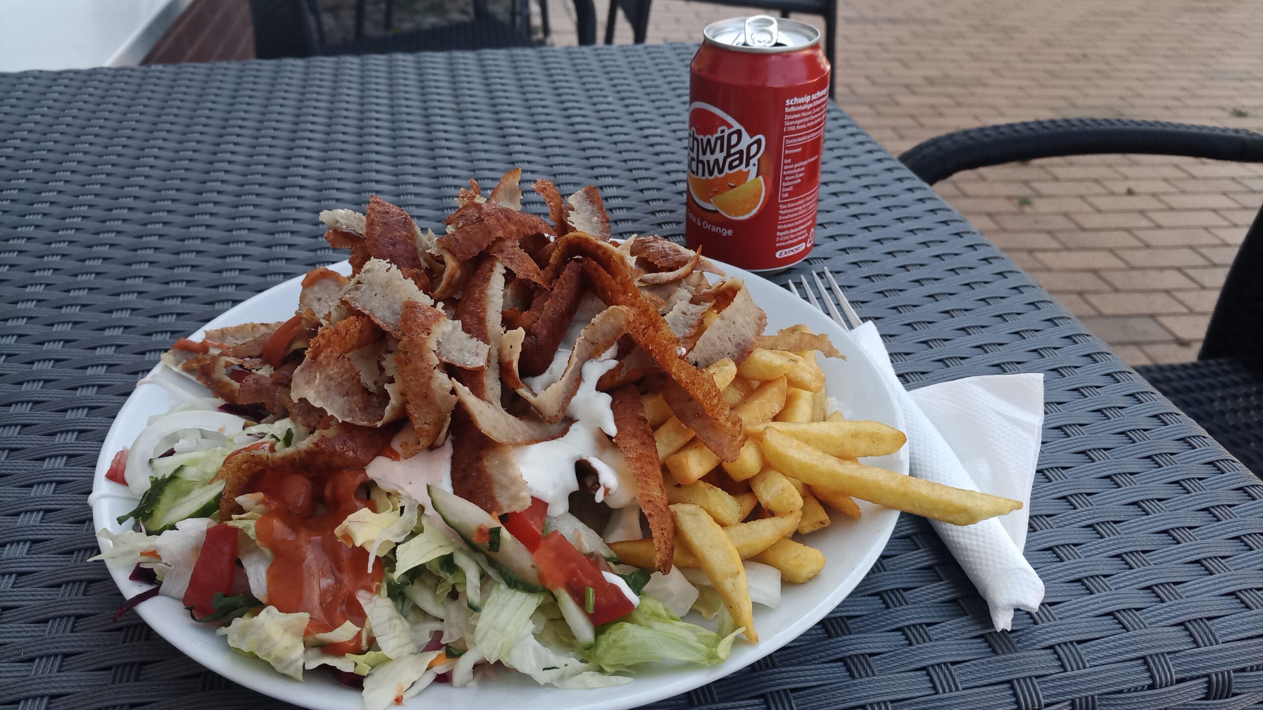 Nach einer angenehmen Dusche machte ich mich auf den Weg zu einem nahen türkischen Imbiss. Ich hatte mich schon seit einigen Tagen darauf gefreut, in so einem Imbiss richtig zu schlemmen. Endlich so richtig mit ungesundem Zeug den Magen voll schlagen!